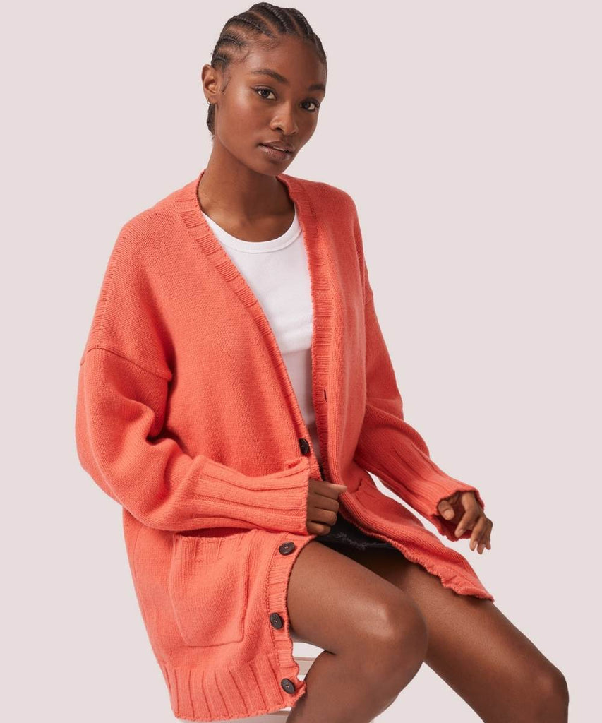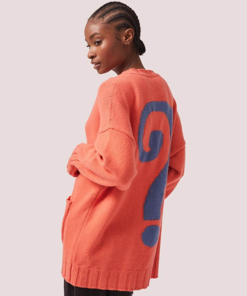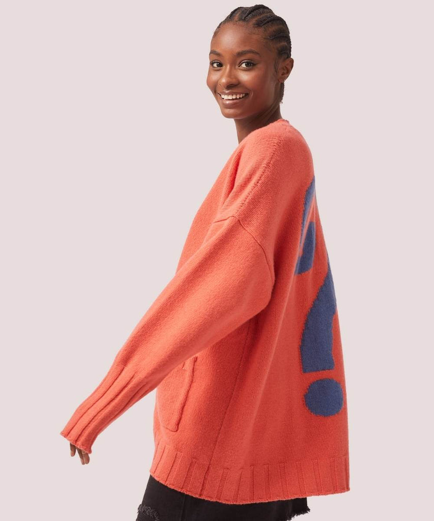 Joey is a boyfriend cardi for anyone and everyone who wants to snuggle up in 100% recycled cashmere. It does what it says on the tin – it’s designed to be roomy with maximum cuddle appeal, and it’s meant to be borrowed – so don’t complain when it’s gone AWOL . The ? on the back is inspired by Joey, (one of the Bee sons), who was one of those kids that started questioning everything as soon as he uttered his first word, and he still hasn’t stopped.