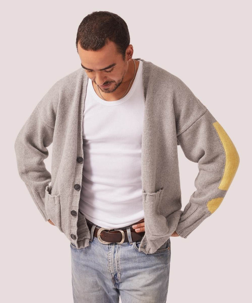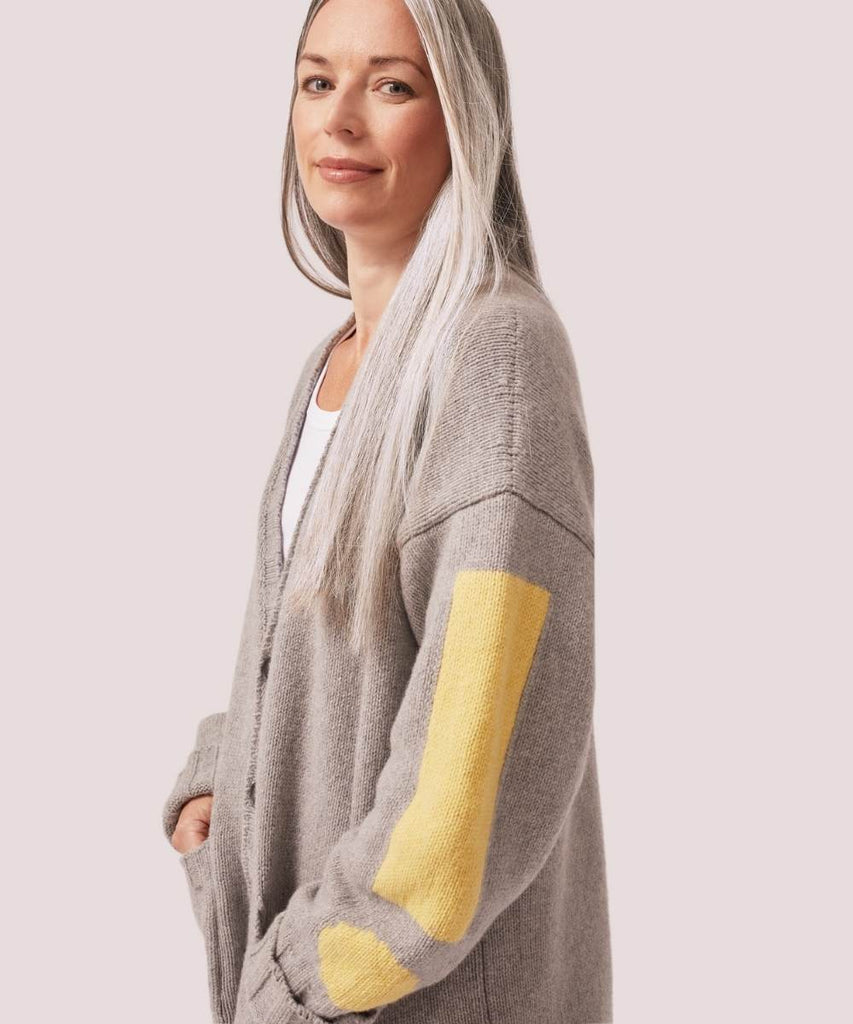 Oskar is a boyfriend cardi for anyone and everyone who wants to snuggle up in 100%recycled cashmere. It does what it says on the tin – it’s designed to be roomy with maximum cuddle appeal, and it’s meant to be borrowed – so don’t complain when it’s gone AWOL . The ! on the left sleeve is a reminder to have fun and be constantly surprising, much like Oskar (one of the Bee sons), my inspiration for this cardi.